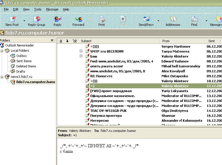 И, согласитесь, Outlook Express - один из самых популярных usenet-клиентов, в смысле NNTP. Конечно, встроенные есть и в Опере, и еще в половине всех известных браузеров, но, я думаю, что мало кто юзает встроенный в оперу, например, почтовый клиент...